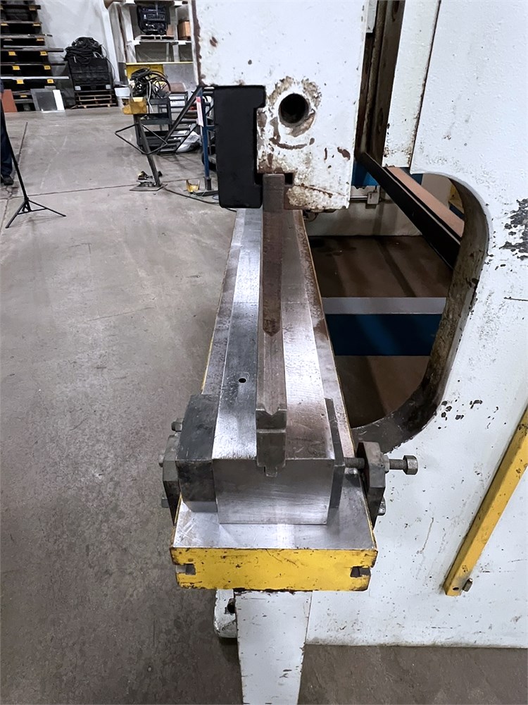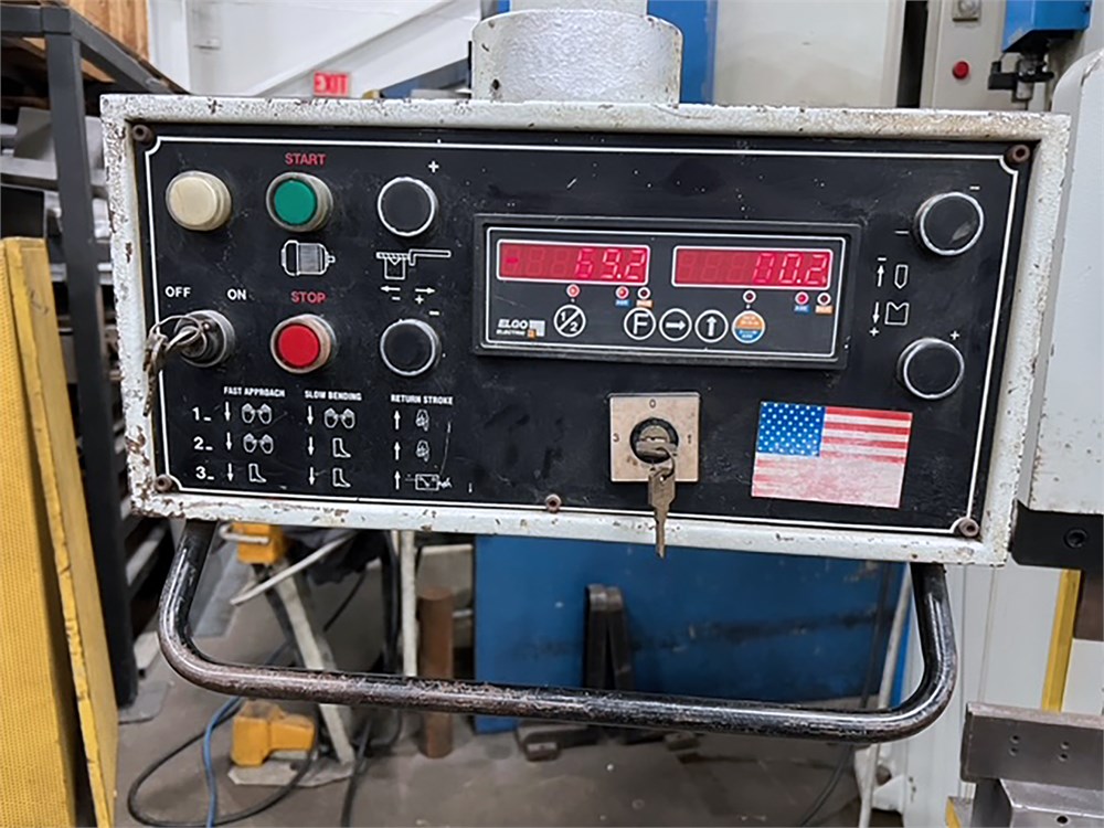 Includes 2-Axis Control with DRO Mounted on Swing Arm, Powered 24" Backgauge with Front Fine Tune Adjustment Wheel, Fast/Slow Ram Speed, Depth Stop Adjustment, 12' L x 5" W x 4.5" H Die Rail, T-Slot Machine Groove In Front of Bed, (2) 20" Sheet Supports, Foot/Palm Pedestal Ram Control.
