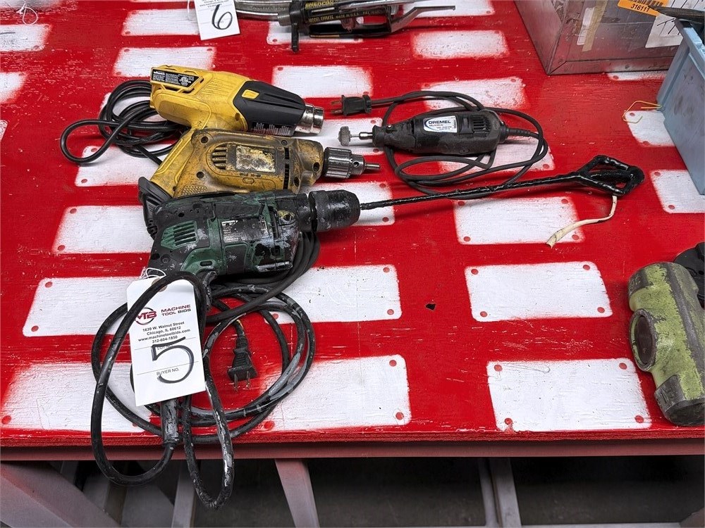Lot of (1) HITACHI Rotary Hand Drill, 120 V, 0-2700/min (RPM) w/ Attached 14'' Paint Mixing Wand, (1) DeWalt 3/2'' Rotary Hand Drill, (1) WAGNER Double Insulated Heat Gun & (1) DREMEL 395 T6 Multi-Pro Hand Drill 5,000-35,000 (RPM)