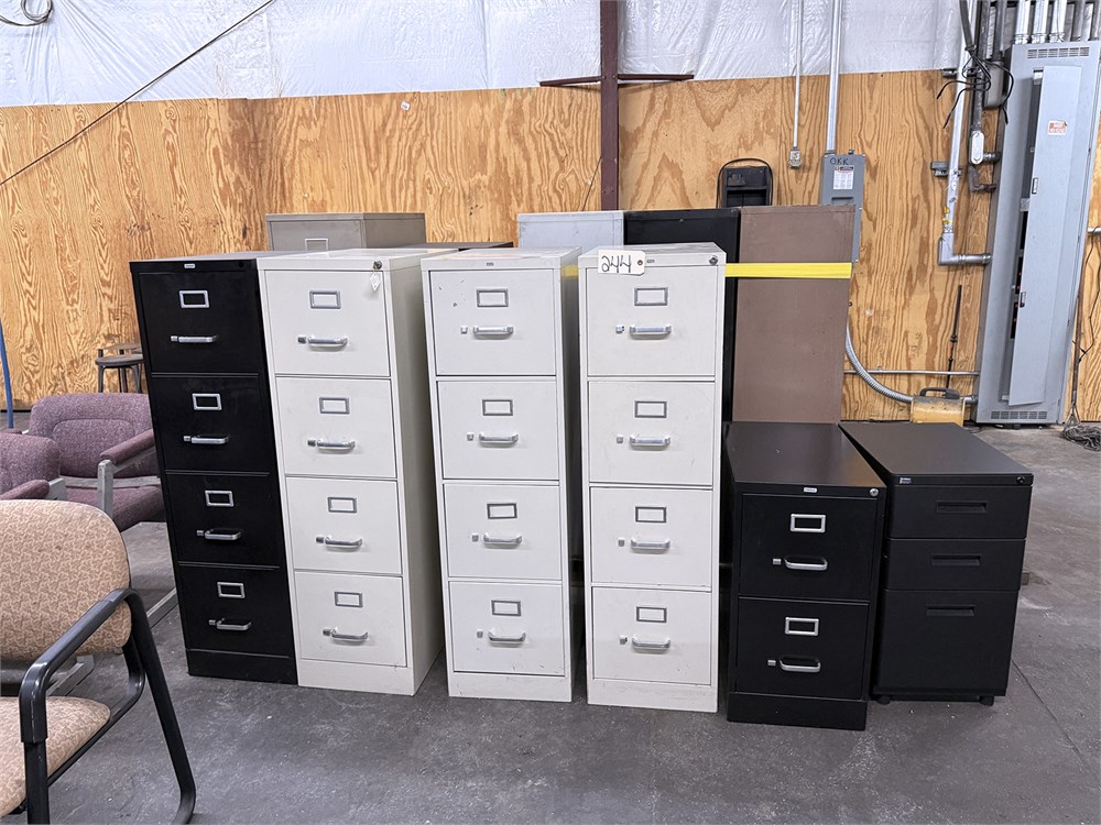 (1) Lot of (9) Various Size Filing Cabinets w/ Assorted Office Chairs & Stools